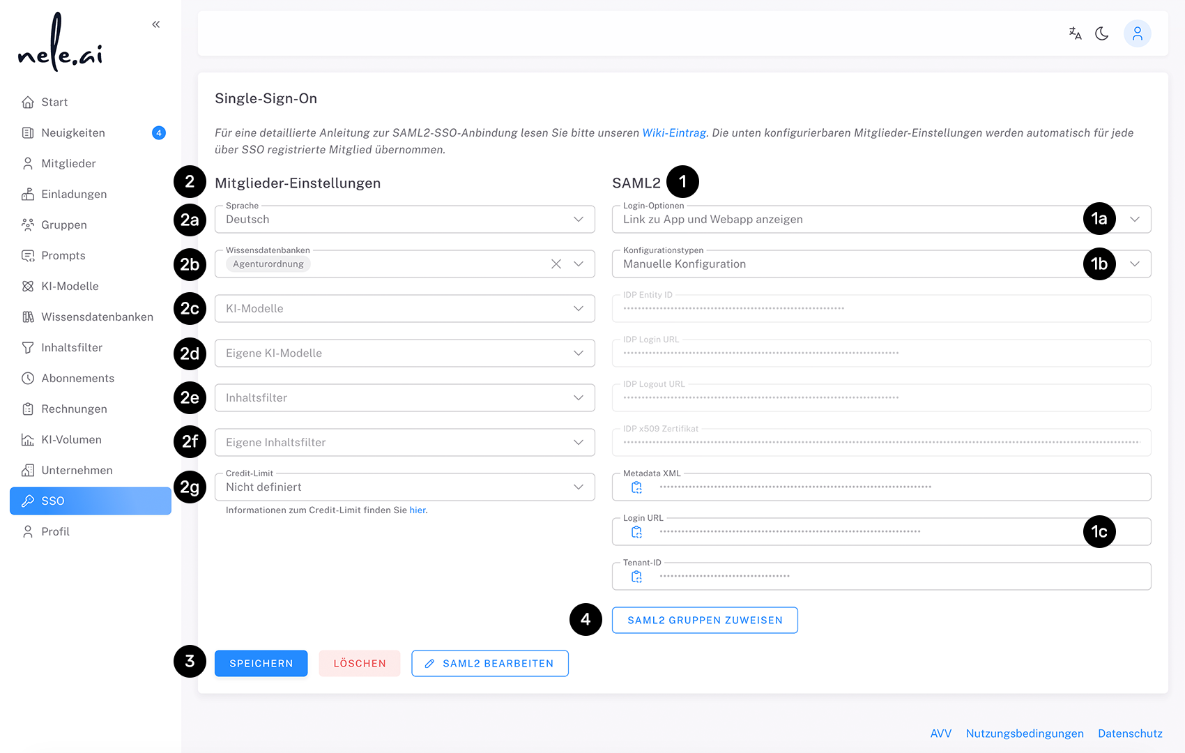 After the general setup of the SSO feature is complete, you can make member settings, known as default settings (2). This includes their language (2a), assigned knowledge databases (2b), assigned AI models (2c), assigned own AI models (2d), assigned content filters (2e), assigned custom content filters (2f) and the monthly credit limit (2g)which should be available.